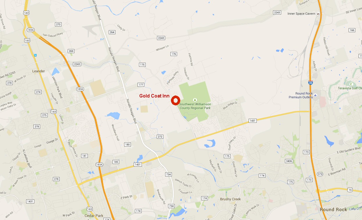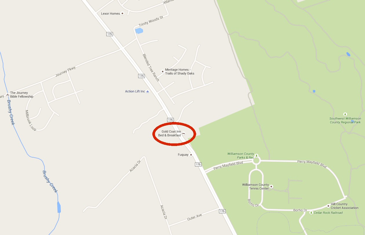 The Gold Coat Inn Bed & Breakfast is located east of Leander, TX, on County Road 175 next to the Southwest Williamson County Regional Park. www.goldcoatinn.com