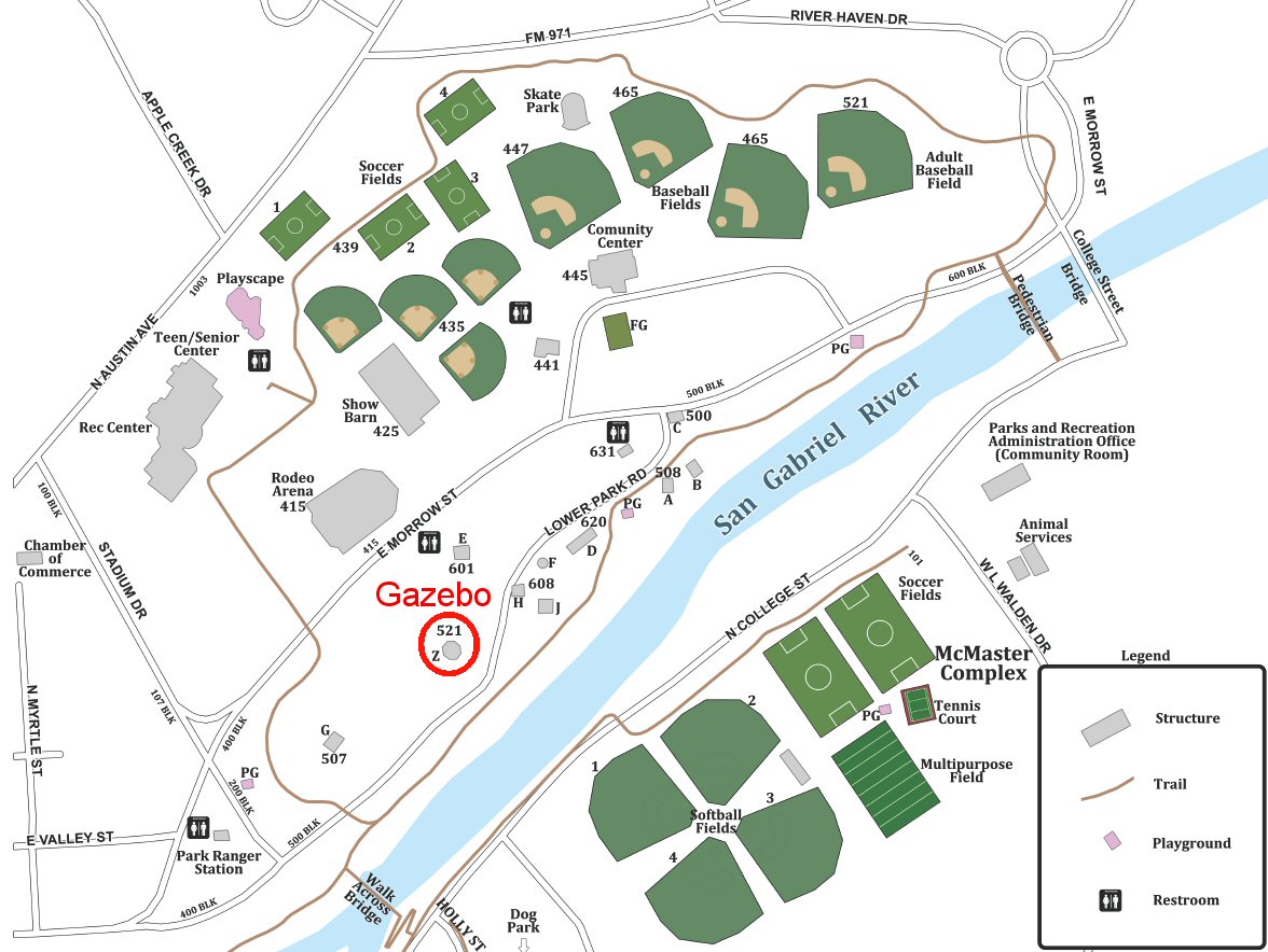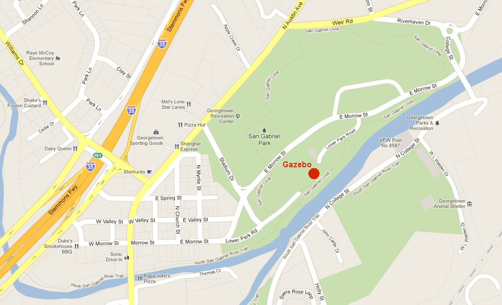 The San Gabriel Park is located just east of IH35 at the Andice Exit (261) in Georgetown, TX.